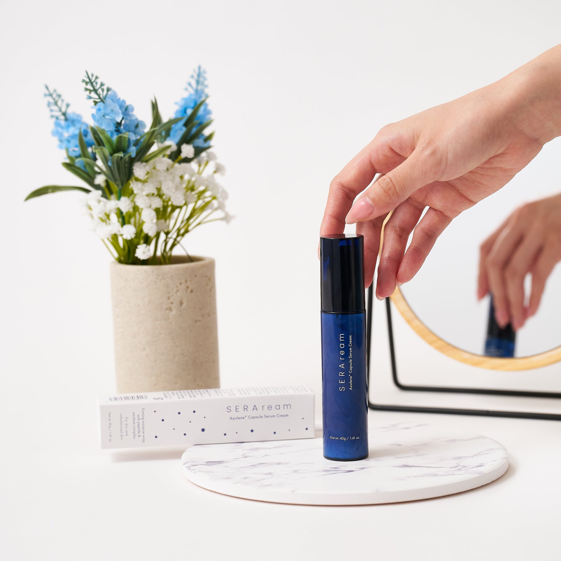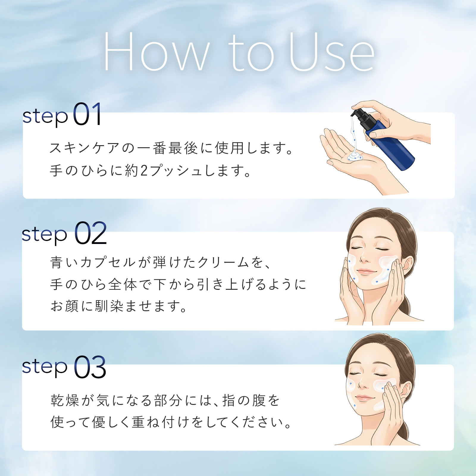 クリームの中の青いカプセルには、パルミチン酸レチノール(ビタミンA)を凝縮。ポンプを押す瞬間まで成分を保護し、いつでもフレッシュな状態で角質層へ届けます。
